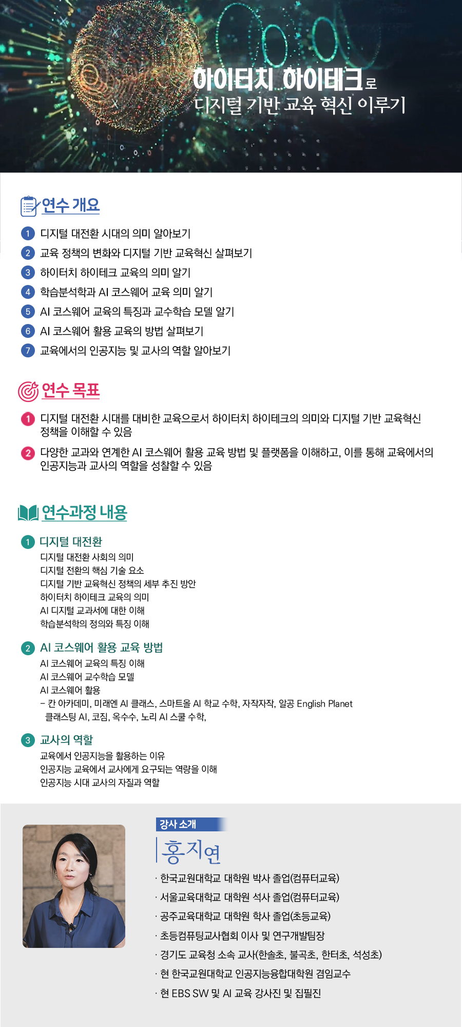 하이터치 하이테크로 디지털 기반 교육 혁신 이루기 초ㆍ중등 1학점 연수 구분 직무연수 수강신청 기간 상시 수강신청 연수 대상 전국 유ㆍ초ㆍ중등 교원 및 교육행정직 수 강 료 50,000원 기수 선택 2026년 04기, 2026.04.04 ~ 2026.06.30 2026년 05기, 2026.05.01 ~ 2026.07.31 2026년 06기, 2026.06.01 ~ 2026.08.31 2026년 07기, 2026.07.01 ~ 2026.09.30 맛보기 수강 신청 과정 안내 과정 목차 연구 및 집필진 연수 후기 연수 내용 이수 안내 이수학점 1학점 평가방법 온라인 평가 60점, 참여 점수( 설문조사: 40점 ) = 총점 100점 이수기준 총점 60점 이상 + 진도율 90% 이상 이수기간 학습 시작일 ~ 이수기준 충족일 이수증 발급 이수 완료 후 다음 날에 홈페이지에서 출력 가능 과정 안내 과정 목차 연구 및 집필진 연수 후기 1. 디지털 대전환 시대의 의미 2. 교육정책의 변화와 디지털 기반 교육혁신 1 3. 교육정책의 변화와 디지털 기반 교육혁신 2 4. 하이터치 하이테크와 교육 5. 학습분석학과 AI 코스웨어 교육 6. AI 코스웨어 교육의 특징과 교수학습 모델 7. AI 코스웨어 활용 교육방법(1) : 칸 아카데미 8. AI 코스웨어 활용 교육방법(2) : 미래엔 AI 클래스 / 스마트올 AI 학교 수학 9. AI 코스웨어 활용 교육 방법(3) : 자작자작 / 알공 ENGLISH PLANET 10. AI 코스웨어 활용 교육 방법(4) : 클래스팅 AI 11. AI 코스웨어 활용 교육 방법(5) : 코짐 12. AI 코스웨어 활용 교육 방법(6) : 옥수수 / 노리 AI 스쿨 수학 13. AI 코스웨어 활용 교육의 의미와 한계 14. 교육에서의 인공지능 역할 돌아보기 15. 인공지능 시대의 교사 과정 안내 과정 목차 연구 및 집필진 연수 후기 홍지연한국교원대학교 대학원 박사(컴퓨터교육)서울교육대학교 대학원 석가(컴퓨터교육)공주교육대학교 학사 졸업(초등교육)초등컴퓨팅교사협회 이사 및 연구개발팀장경기도교육청 소속 교사(한솔초,불곡초, 한터초, 석성초)현 한국교원대학교 인공지능융합대학원 겸임교수현 EBS SW 및 AI 교육 강사진 및 집필진 과정 안내 과정 목차 연구 및 집필진 연수 후기
